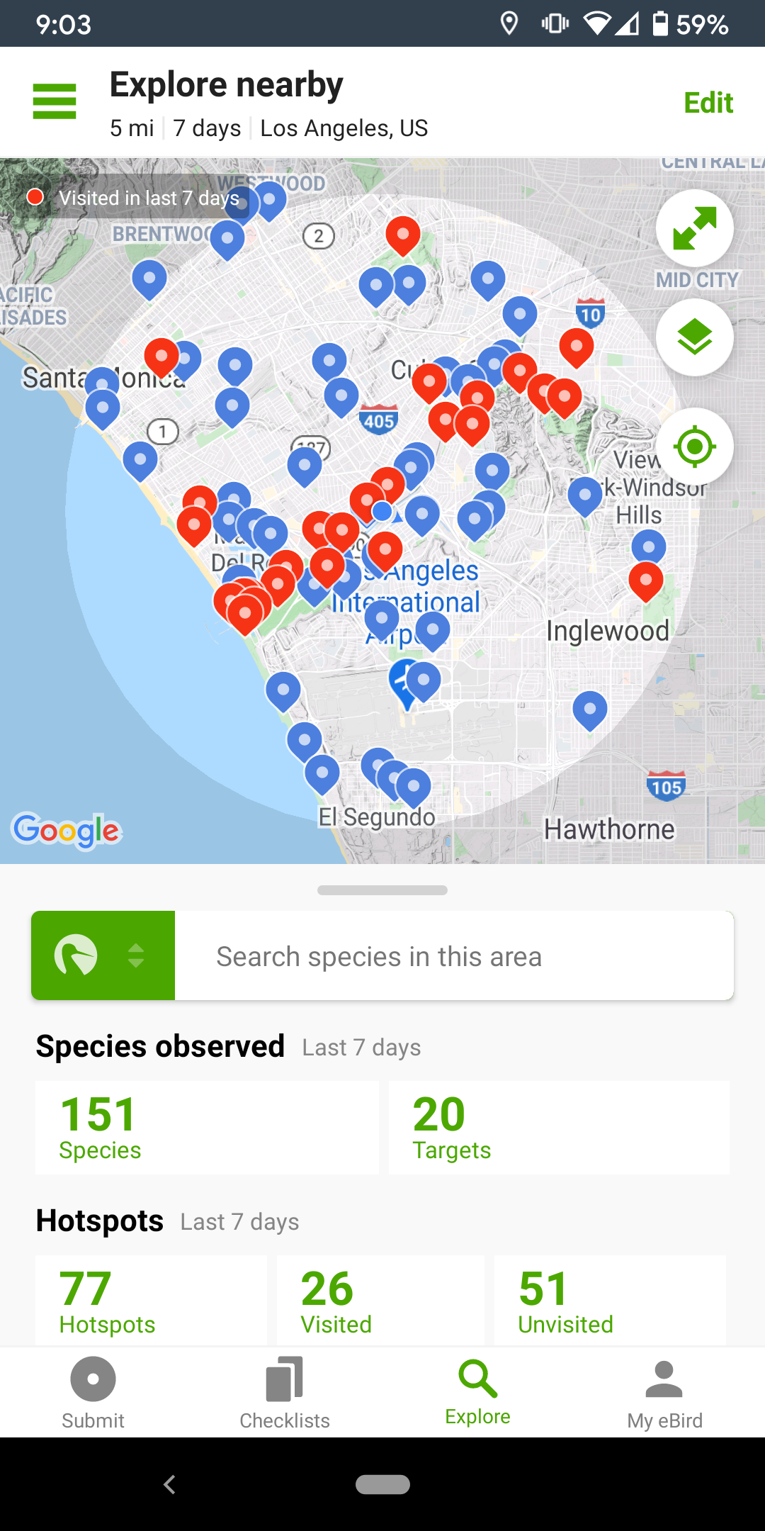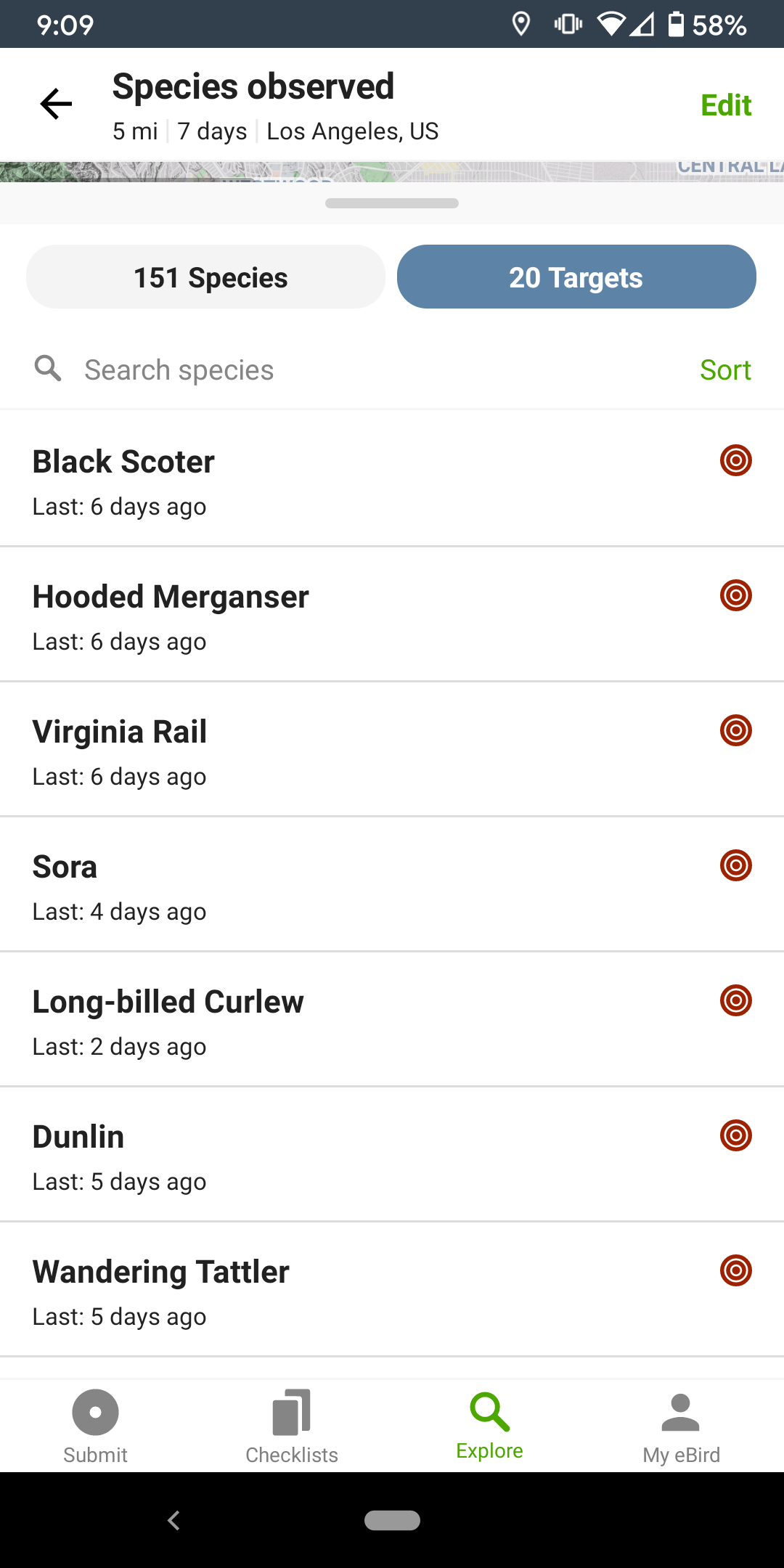 To access it, open the eBird mobile app on your phone, and click “Explore” at the bottom of the screen. It draws a 5-mile circle around your precise location by default. So if you do it while actually sitting on your living room couch, you’ll get your exact 5MR. It then tells you which locations have been visited recently (the red pins), how many species in total have been observed in the last 7 days in your circle (who cares), and–most importantly–the species reported in your circle that you haven’t seen. These are the “targets.”