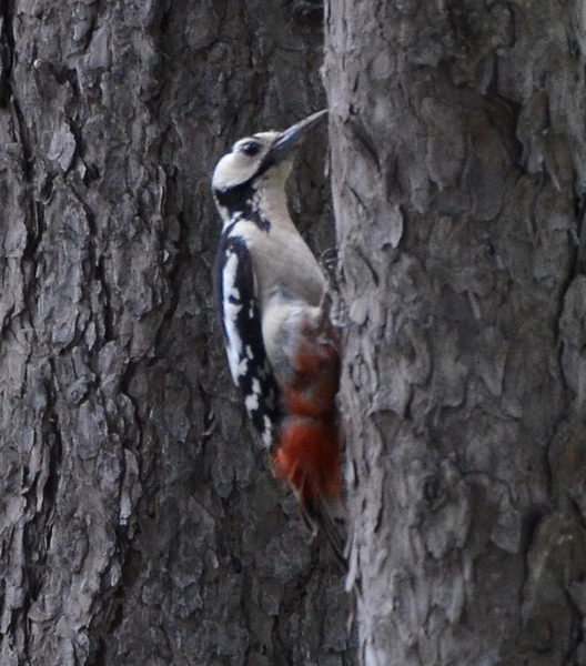 I came back the next morning and, despite the additional presence of a half-dozen other birders, didn’t find any Pine Grosbeaks and couldn’t pick a Bohemian Waxwing out of a flock of two dozen Cedar Waxwings. Each day, the Pine Grosbeaks were reported either before I arrived or in the afternoon after I left. I stayed home on Thanksgiving, but was out again on Friday morning. The wind was gusty. There was occasional light drizzle. And I didn’t see any grosbeaks or waxwings. Saturday was the last day of our trip, and thus my last chance. I showed up at 8am, apparently 15 minutes after the Pine Grosbeaks had made a brief stop at the crabapple trees. After an hour of half of stalking the same quarter-mile of trail, my patience was finally rewarded. I heard the Pine Grosbeaks before I saw them. Conveniently, they then flew atop a pine tree for clear views. They’re big finches with some delicate plumage.