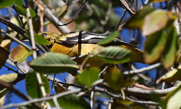 The third of the trio was found in one of my favorite parks to bird in my 5MR – Ladera Park. It’s a rectangular shaped collection of tall trees just south of Kenneth Hahn Park and the Inglewood Oil Field. Thanks to the tall trees, it’s a good spot for songbirds. In the past, it’s hosted Dusky-capped Flycatcher, Prothontary Warbler, Varied Thrush, and is maybe the best spot in my circle for wintering Plumbeous Vireo. I was not expecting any kind of oriole at Ladera Park when I visited in mid-November (orioles clear out by the end of September around here), much less a Baltimore Oriole. But I was definitely looking at an oriole high up in the sycamores. I first thought an odd, late Hooded Oriole. But that ID wasn’t adding up as I watched this bird deliberately move through the upper canopy. The top of the tail was orange, not black, and there was a patch of black on the birds lower neck that was not in the right place for Hooded. I next thought Bullock’s Oriole, but they usually show a lot more white on the lower belly and a stronger eyeline.