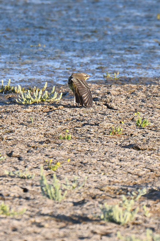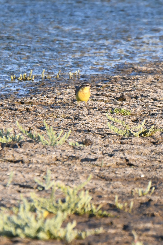 When I arrived, I scanned the area and didn’t see the Pectoral. I did notice a bird with a brown-ish back and cap pumping its tail that I first thought was an American Pipit. But as it moved around, I saw that this bird’s underside (chest, belly, undertail) was obviously yellow, the chest had no streaking, and the bird had an eyebrow (supercilium, if you must) that was decidedly thick and white. All of that ruled out American Pipit for me.