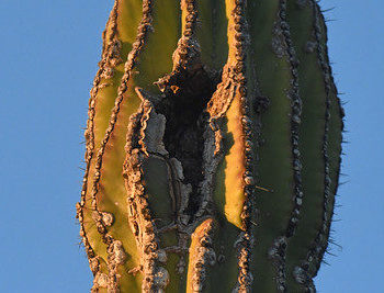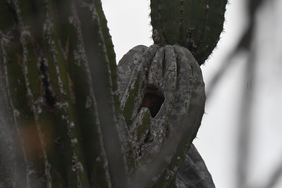 On my second trip, I went out alone around 8:30pm. It was dark, though lit by a full moon. I stopped at 3 locations along the road and played an Elf Owl call. At each spot, I got responses from 1-3 individuals. A couple were in trees just off the road. While I heard some fluttering that I suspected was a flying Elf Owl, I never saw one. The third trip was the charm. With my son again alongside, we arrived 45 minutes before sunset. We were hoping to see an owl in a woodpecker hole, or maybe even perched on a cactus, while we still had some daylight. We stopped at the spot where I’d heard an owl just off the road, wandered, and checked woodpecker holes. I found two Ladder-backed Woodpeckers peeking out of cactus cavities, but no owls. My son found a cactus that really looked like it had a roosting Western Screech Owl, but it was an illusion.
