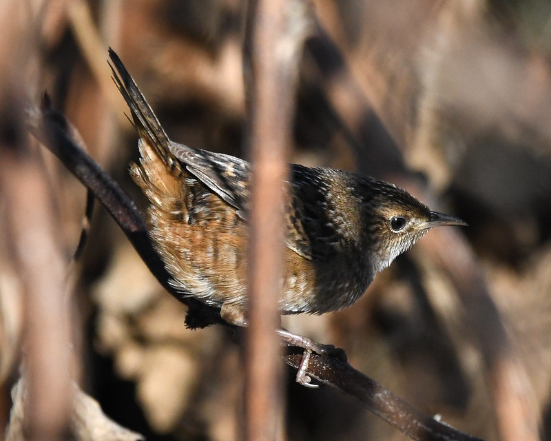 One of the birds I saw inside the bushes was a tiny wren. It was generally skulky, but active. The quick views I got were of a tiny wren with a streaked upper back and a cocked tail. In these parts, that would be a Marsh Wren. But this habitat was decidedly wrong for a Marsh Wren. This place is bone dry (except the liquid methane gurgling through the PVC pipe all around), and is dominated by pokey scrub bushes, not bright green reeds. Sensing the oddity, I snapped a couple of pictures and resumed my search for longspurs. An hour later, I was back at the cocklebur, having failed to flush any longspurs or anything else super interesting. The tiny wren was still moving around and occasionally giving a slurpy chewp call that I didn’t associated with Marsh Wren. This prompted me to check my bird guide app to see what else it might be. The only other option was Sedge Wren – similar in size and appearance, but with a few distinctions that I could look for. Sedge Wren is a bird of the Upper Plains (in summer) and American South and northwest Mexico (in winter). One had never been reported in L.A. county in eBird. As a firm believer in the notion that a bird is most likely to be a likely bird, I was probably looking at a juvenile Marsh Wren.