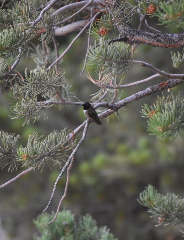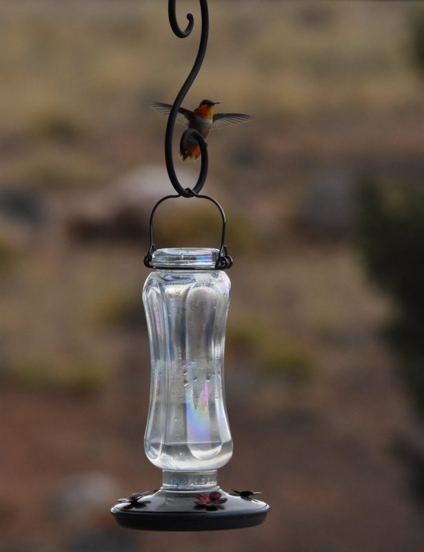 Whenever we visit the house on Torrey Mesa (Utah), we put some sugar water in a hummingbird feeder and hang it from the awning over the back porch. Within a couple of hours, the hummingbirds start to show up. We see three different hummingbird species in this arid, high elevation spot: Rufous Hummingbirds, Black-chinned Hummingbirds, and Broad-tailed Hummingbirds. They’re often skittish at first. After a couple of days, though, they come to tolerate our presence on the porch nearby. Indeed, the kids even get hummingbirds to land on their fingers to feed.