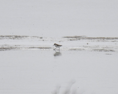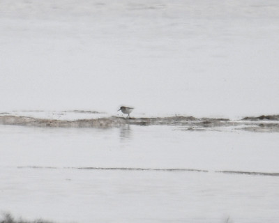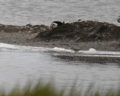 It’s usually seen in the morning to mid-day, but I showed up at the spot at 4:40pm. There was a birder present, with a big zoom lens. Displaying classic birder social awkwardness, he left the platform as I was approaching. I yelled “it is out there?” and he said “yes.” When I scanned the island, there were 5 peeps moving about. One was (almost certainly) the Little Stint. But it was a gray overcast sky, and I don’t have a scope. I had about 10 minutes with the peeps before they flushed with some Black Skimmers. During that time, I became pretty confident that I could pick out the Little Stint. It had a white chin, clean white sides, black legs, and I could convince myself it was smaller than the other peeps (which were Western Sandpipers). I didn’t see the aggressive behavior so many eBird reports include from the bird I tagged as a Little Stint, but each time I came back to look over the peeps, I kept ending up on this one bird as being different from the other 4.