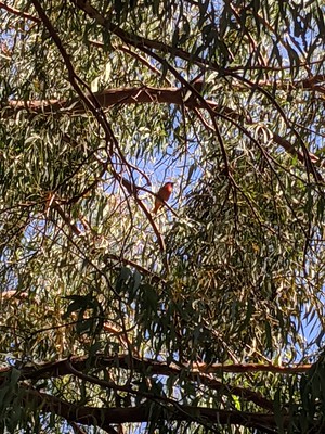 As I was waiting for a frisbee golf game to get organized, I noticed a bird flush from a tree about 20 yards away. The bird flew directly away from me, and it looked to have been all red. Given its size, I immediately thought Summer Tanager. The bird landed in the middle of a tall eucalyptus tree. Since a Summer Tanager would be a nice summer find in my 5MR, I decided to walk over and see if I could get a better look. It didn’t take long. As I walked up to the target tree, I found a male Summer Tanager – all red, with a pale yellowish large bill – sitting perfectly still. I took a couple of pictures with my phone that are crap, but good enough to support the ID.