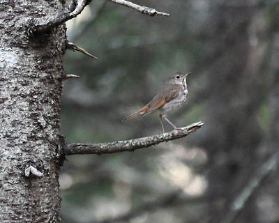 The forests were also full of the entrancing song of thrushes. By the end of the week I was able to distinguish unseen Hermit Thrushes from Swainson Thrushes. These photos show the visual difference between the two: the Hermit Thrush on the left has a grayer head, white eyering, and a redder tail. The Swainson’s Thrush on the right is buffier around the eye, and the back and tail more uniformly colored.