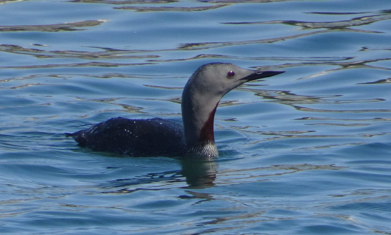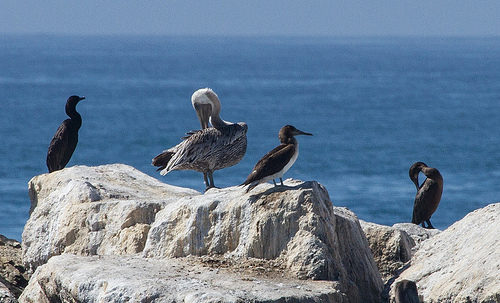 Despite all the action on the rocks, you’ve got to keep your eyes on the skies, too, as there’s usually plenty of action. Gulls are most numerous, and mob the fishing boats as they return to harbor. Western Gulls are present in the biggest numbers, all year round. The beautiful Heerman’s Gulls (both white-headed adults and chocolate juveniles) are here nearly year-round, but in sporadic numbers. Ring-billed Gulls dwindle in the summer, but are common in the winter. Bonaparte’s Gulls, Short-billed Gulls, Herring Gulls, Iceland Gull, and Glaucous-winged Gulls are strictly winter birds. Only two reports (1975 and 2009) of Glaucous Gull suggest they don’t prefer the area. There aren’t any reports yet of Lesser Black-backed Gull here, but their rising numbers in L.A. County suggest that one will soon be found here. Careful observers can knock themselves out trying to ID the hybrid gulls as well.