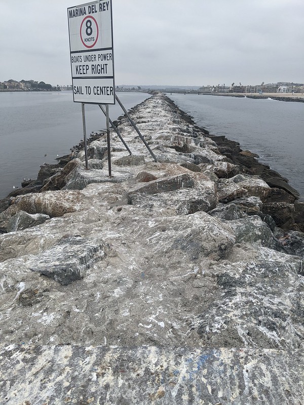 This post in my guide to birding Ballona Creek covers the area of Ballona Creek where it spills into the Pacific Ocean (that is, the portion west of the Pacific Avenue bridge). The creek channel here is straight as an arrow, thanks to a 1930s channelization project. It is lined by big rock jetties on each side. For convenience, I’ve numbered the unnamed jetties in the map above. Folks sometimes refer to #2 as the middle or long jetty, and #3 as the short jetty (or the southern jetty). They’re the jetties most birders explore, since they’re easy to access from parking at or around Del Rey Lagoon. Jetty #2 and Jetty #3 have flat sidewalk surfaces you can stroll down, though the last 100 yards of #2 is uneven rock. There are far fewer reports from the northern-most jetty (#1). I rarely visit jetty #1 because the bike path doesn’t go past it, and it’s more than twice as far to drive to that side of the creek from my house as it is to drive to Del Rey Lagoon. The bike path is in red, and continues for miles south along the coast.