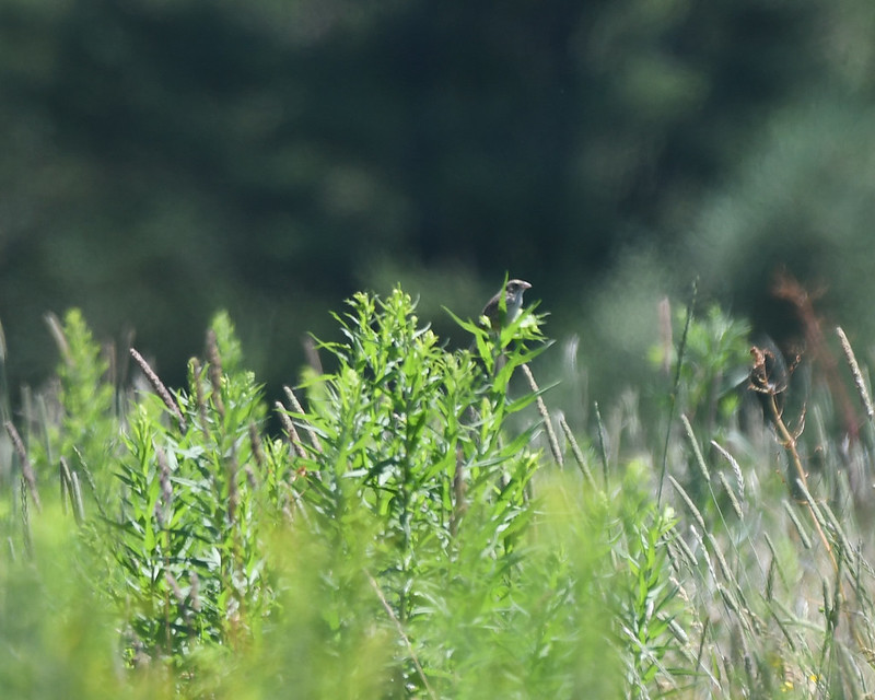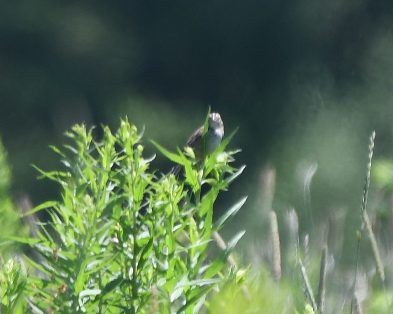 Before we drove back to Boston for our flight home, I checked eBird to see if there were any possible lifers along the way. It turned out that a guy had recently found a Henslow’s Sparrow in a field along the side of the road (he was apparently driving by with his windows down, and heard the bird. Notably, Henslow’s Sparrows have the shortest song of any North American songbird, so this is quite a ridiculous find). It was only the 4th record ever for Maine of this declining grassland sparrow, and the spot was just 5 minutes off the highway. It promised to be a short stop: either the bird was there when we pulled up, or we’d stand in place for 5-10 minutes and strike out. If we were lucky, there’d be some birders already present with their scopes pointed at the bird. We were lucky. As we drove up to the location, two other car loads of birders pulled up almost simultaneously with us. At least three different birders were present, peering through binoculars out into the field. We walked up, they pointed to the bush where it was perched singing, and I had a lifer. The bird was a bit far out in the hot field for me to get good photos (see below).