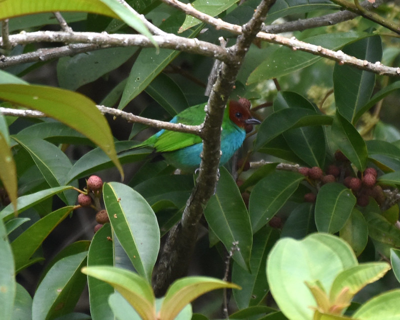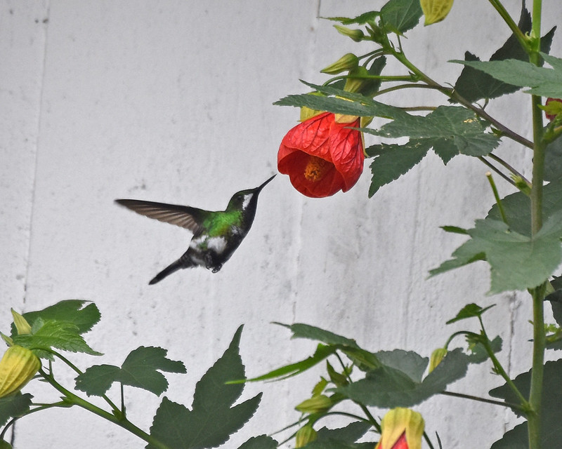 There were gardens, and forest edge around the cabin, so we saw a bunch of good birds. My only Bay-headed Tanager of the trip to Costa Rica was moving around the bushes here. They aren’t rare, but I was delighted to see the odd combination of dark red, blue, and green on a bird. The Green Thorntail pictured below was indifferent to our presence as it worked the flowers that grew on the outer wall of the cabin.