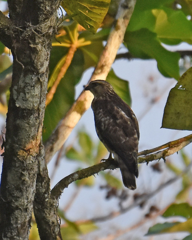 I came to suspect that the Roadside Hawks I kept seeing were actually a single bird that resided on the property. On multiple morning walks, I found it standing on the same rock. Each time, at first glance, I thought the rope it was standing on was a snake. Broad-winged Hawks were more often hidden in the branches of forest-edge trees.