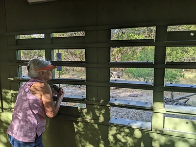 An interlude on birding blinds. We don’t have them in California. But in Texas, they love themselves some birding blinds. Maybe it’s the oppressive heat that motivates the construction of a shelter. Or maybe the birding crowd skews older in Texas, leading to spots to sit. Whatever the reason, many state parks have birding blinds (it’s throughout the state: there was a great one at Franklin Mountains State Park outside El Paso, and blinds are everywhere in the Rio Grande Valley). And these aren’t half-assed jobs, or tiny hunting blinds. They’re big, sturdy, and elaborate. The birding blind at Guadalupe River State Park (below, left) has windows that you can flip open or closed. Guides to common species are hanging from the wall. The blinds are full of feeders and water features, enticing hungry and thirsty birds. When you’re traveling with non-birder, or a budding birder, or just want to do some easy birding and get some wicked photos, bird blinds are fantastic. The birds are so many, and so close. You don’t even need binoculars to make out the birds. There’s a limit to what the blinds attract – some birds just don’t come to feeders (though they will come to water). And they don’t get the birder much exercise. But it would be great to see a few pop up at some California birding spots.
