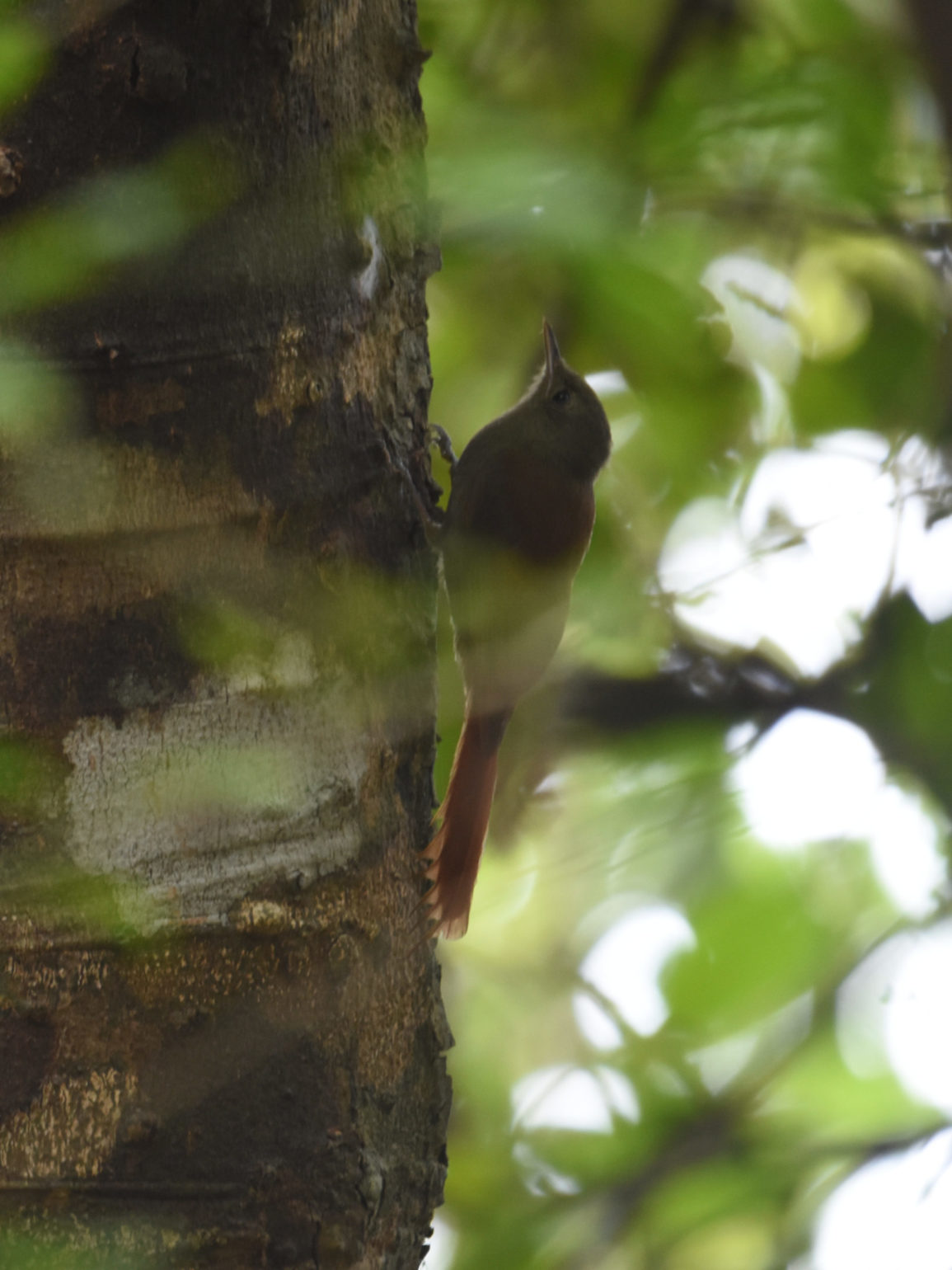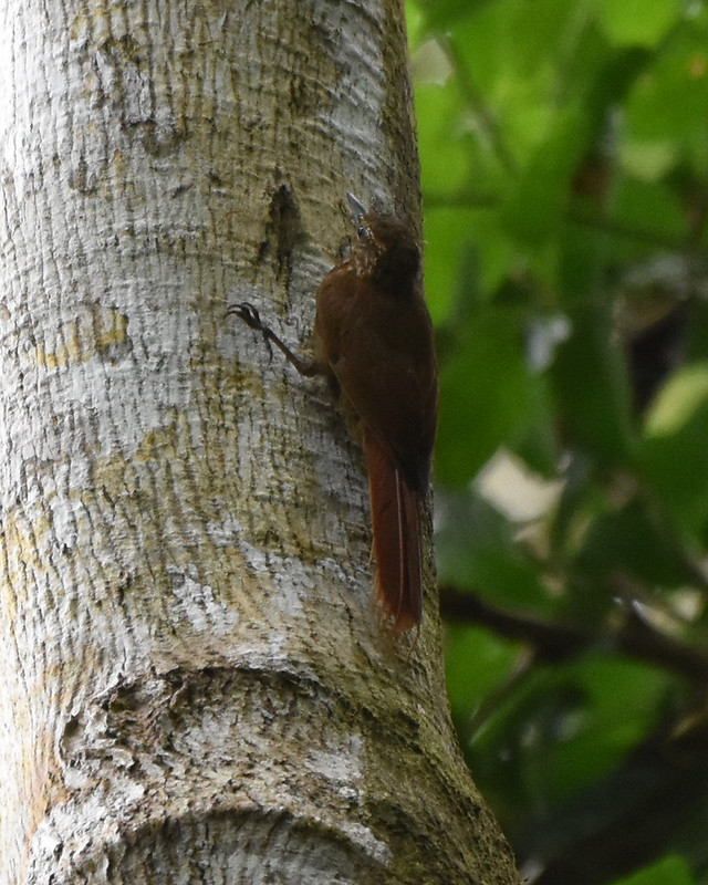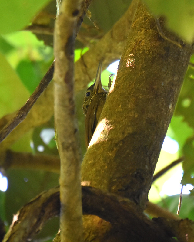 Another new kind of bird I found in Costa Rica were the woodcreepers. They’re like woodpeckers, moving vertically up trunks. But instead of pecking holes in the trunks of trees, they eat insects off the trunks. Most of them are brown, and it’s hard to get clear looks at the heads, bills, and breasts that are the keys to distinguishing them. I saw 5 kinds of woodcreepers on the property: Long-tailed Woodcreeper (small size helps ID), Wedge-billed Woodcreeper (small size and small bill), Cocoa Woodcreeper (long straight bill), Black-striped Woodcreeper (large, bold streaking on upper back), and Streak-heeded Woodcreeper (medium-size, light streaks on head). Many of the views were binocular-only, through 30 feet of dense trees.