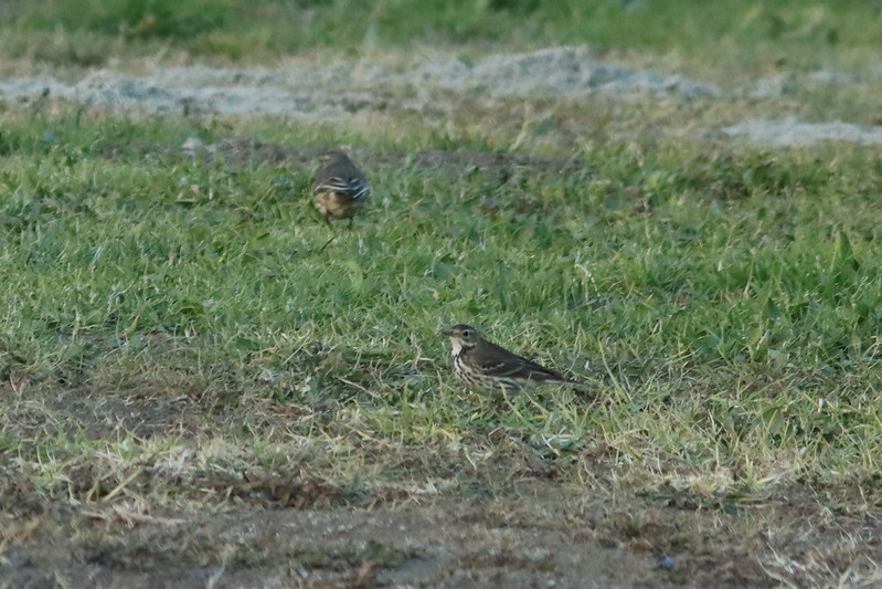 On a late afternoon bike ride a few days ago, I stopped to scan the ballfields. There were some pipits walking and bobbing. As I looked through them from the bike path, one immediately stood out. It had a really dark triangular malar, black streaking on the chest that formed a necklace, white underparts. The dark streaking extended to the flanks. This was obvious even from distance in poor light with my cheap binoculars. I immediately thought Siberian Pipit. Siberian Pipit was previously considered a subspecies of American Pipit. Recently, it was elevated to its own species. And there were only three previous LA County record in eBird — a single bird (probably) that appeared for 3 straight winters at soccer fields near Griffith Park.
