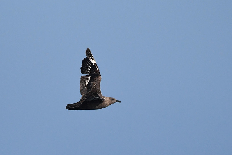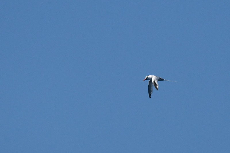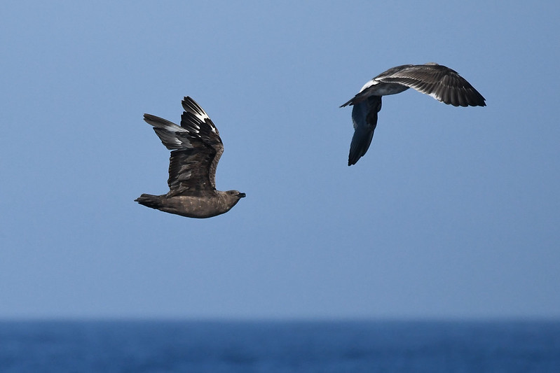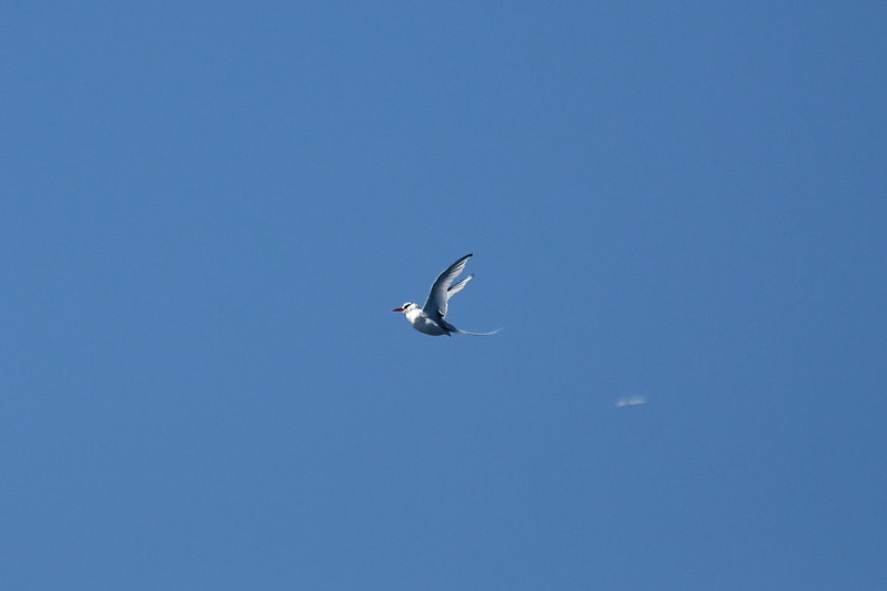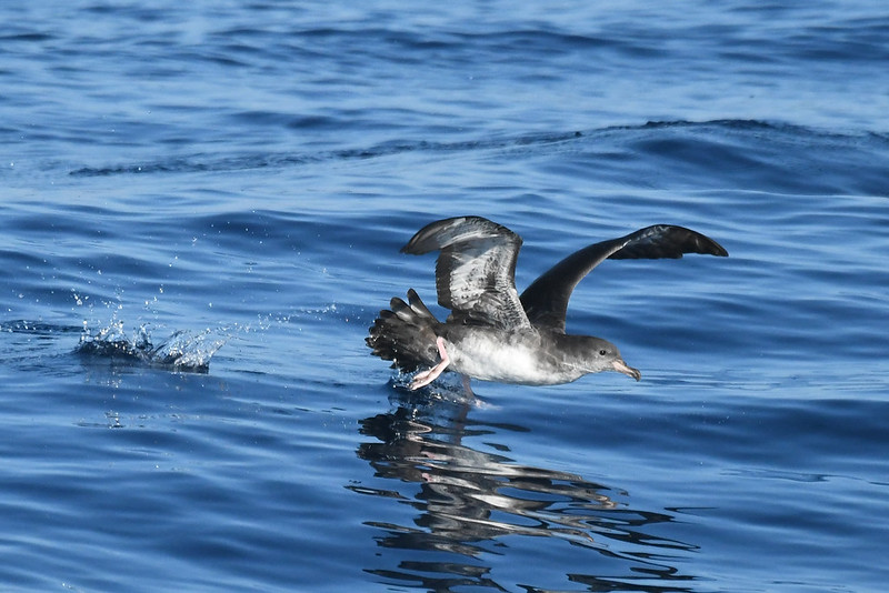 Ten or fifteen minutes later, Tom was at it again. This time, he screamed out “Flesh-footed Shearwater!” This was a rarer bird than either the skua or the tropicbird. And it would be another lifer if I could get my eyes on it. They’re the same size and shape as the Pink-footed Shearwaters it was amongst. The key distinguishing feature is an all dark brown body. It took me some time to find it on the water, but I did. Seconds later, it flew directly away from the boat. I got one picture that I think is the bird, but you can’t tell. Two lifers on the last leg of the trip was a nice finish to the day.