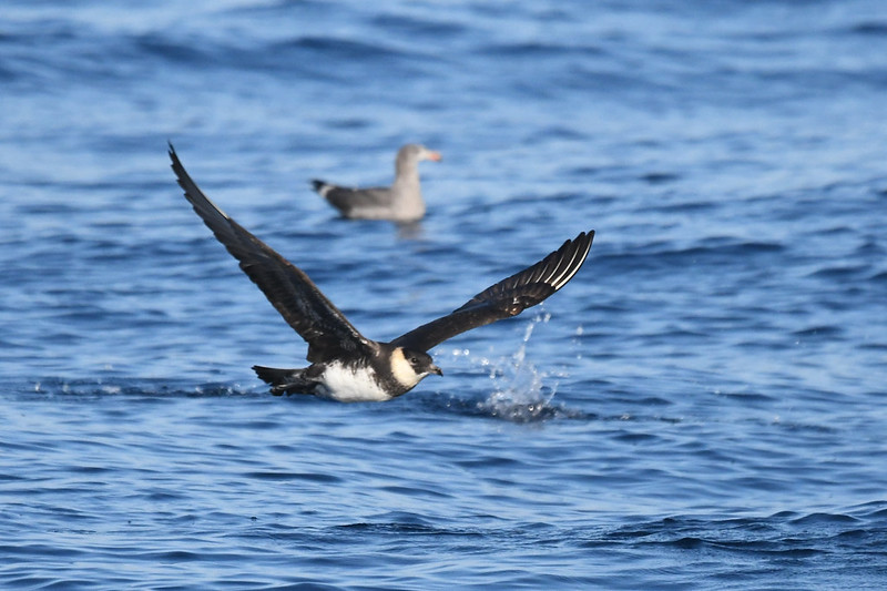 The first good rare find on the boat was a South Polar Skua sitting on the water about 10 miles out. Skua are bulky bullies of the oceans, chasing gulls and shearwaters and boobies, forcing them to drop fish they’ve caught. They breed on the coast of Antartica, and can be found in any ocean. I’d seen a pair of South Polar Skuas on a Maine whalewatching boat. This bird was my first for California. In the same area were a few Pomarine Jeagers. Similar to skuas, but not as large, they “hunt” at sea by stealing fish from other birds. During breeding on arctic tundra, they feed on lemmings.